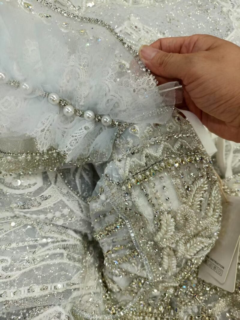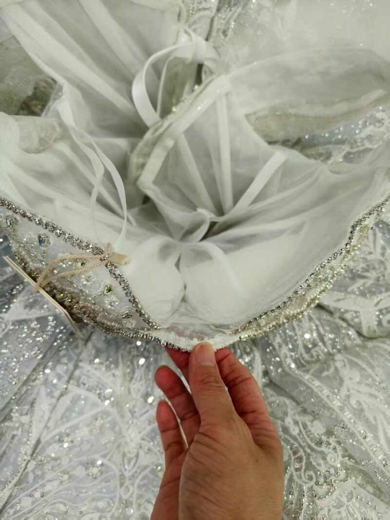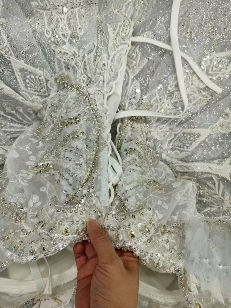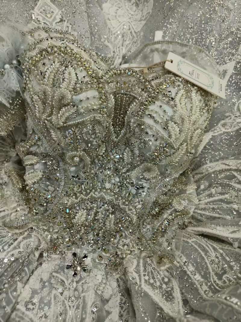 The stunning “Glacier Blue” hue is the soul of this dress—a soft, silvery-ice blue that evokes a sense of serene magic, purity, and cool elegance. It’s a subtle yet striking alternative to traditional white, perfect for making a bold and sophisticated statement.