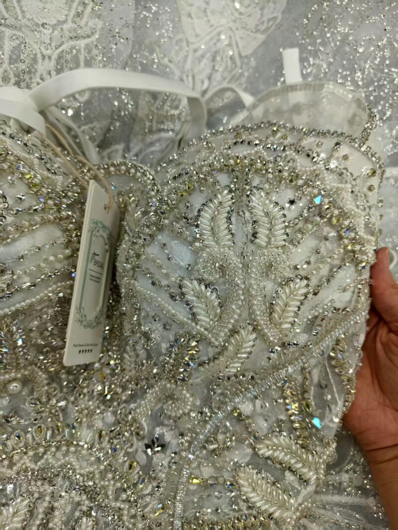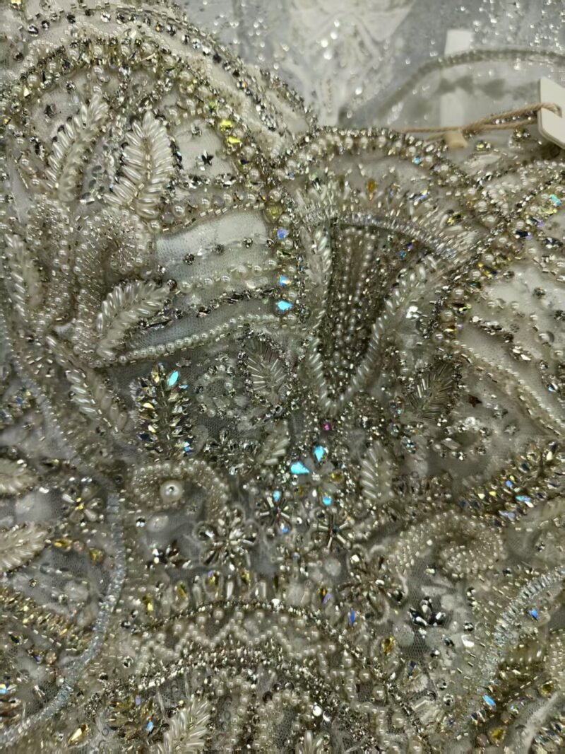 The entire bodice and skirt are adorned with intricate, scalloped-edge lace appliqué, meticulously hand-embellished with hundreds of sparkling crystals and delicate seed beads. This lavish beadwork catches the light with every movement, creating a mesmerizing shimmer reminiscent of morning frost on a tranquil winter landscape.