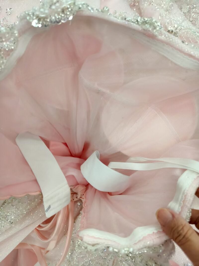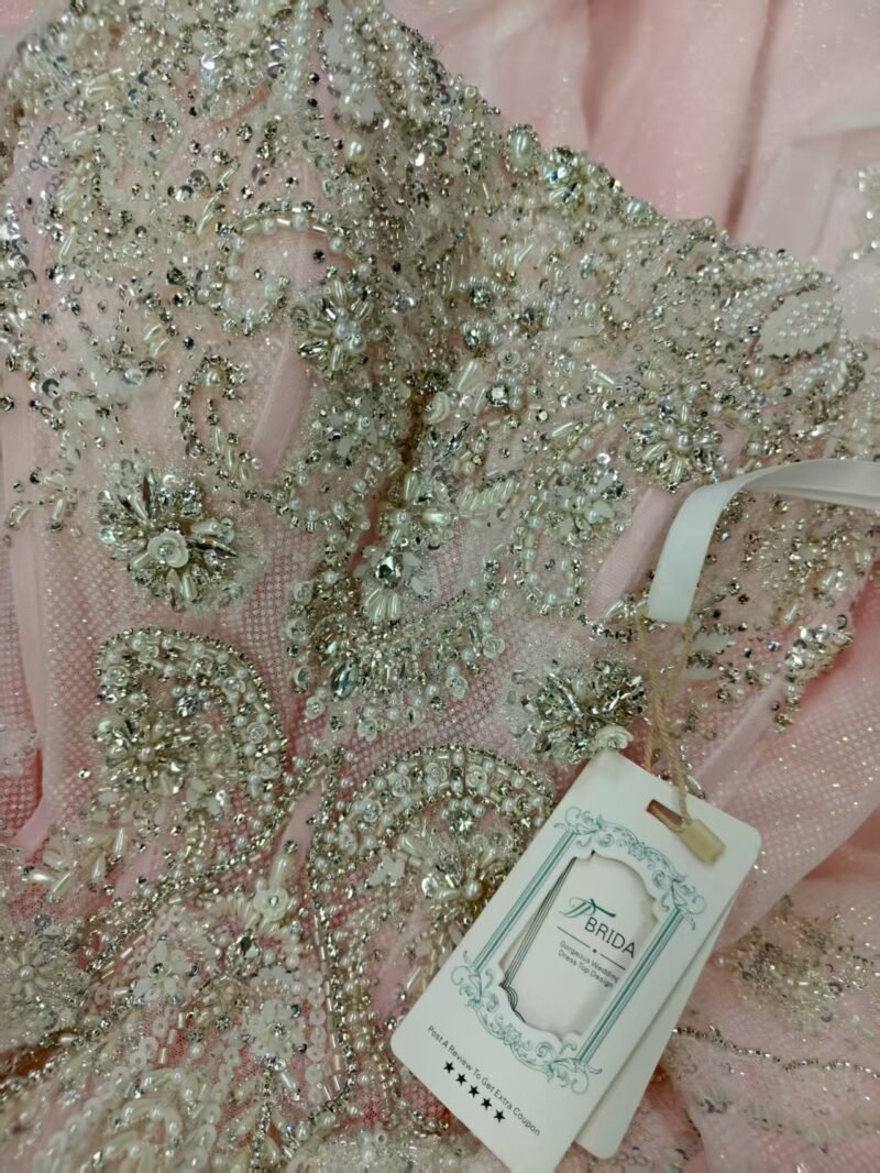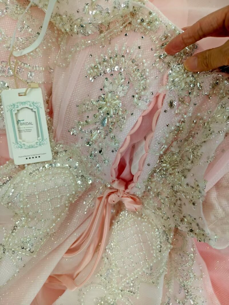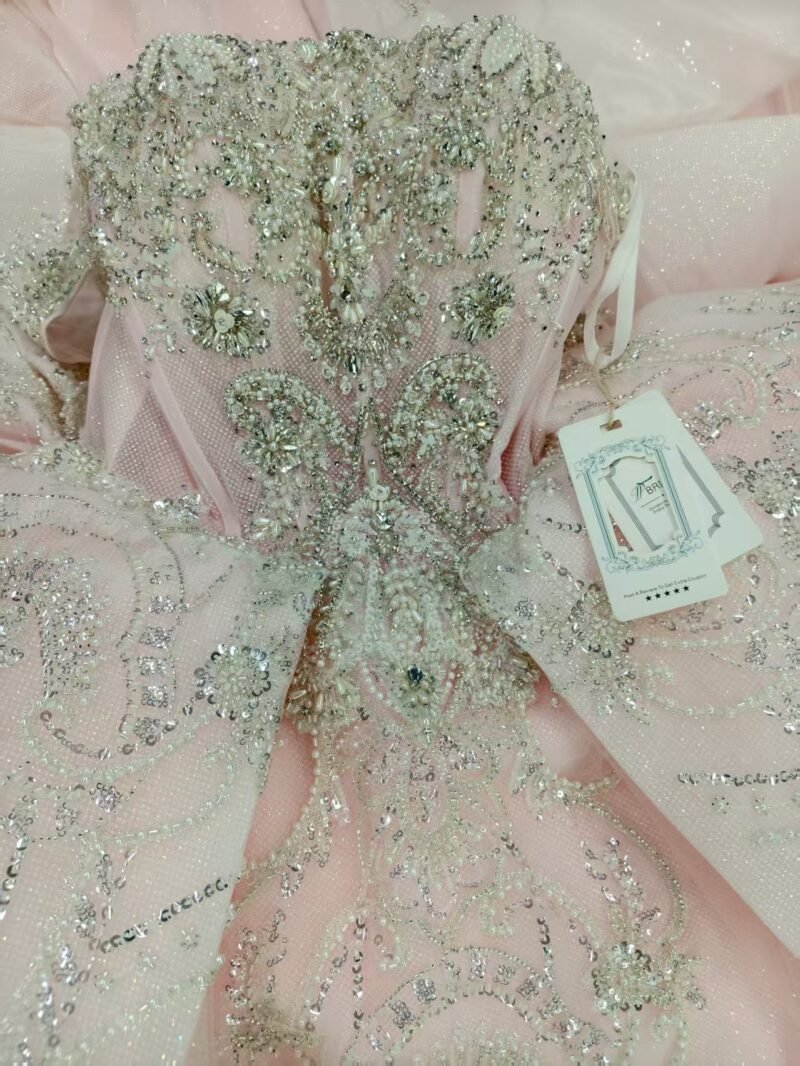 Step into your storybook moment. This breathtaking strapless gown, in the softest shade of pink, is a masterpiece of craftsmanship. Every detail, from the delicate lace to the shimmering hand-applied beads and sequins, catches the light as you move. The voluminous tulle skirt flows around you, creating a vision of pure romance and luxury. It’s more than a dress; it’s the centerpiece of your unforgettable celebration.