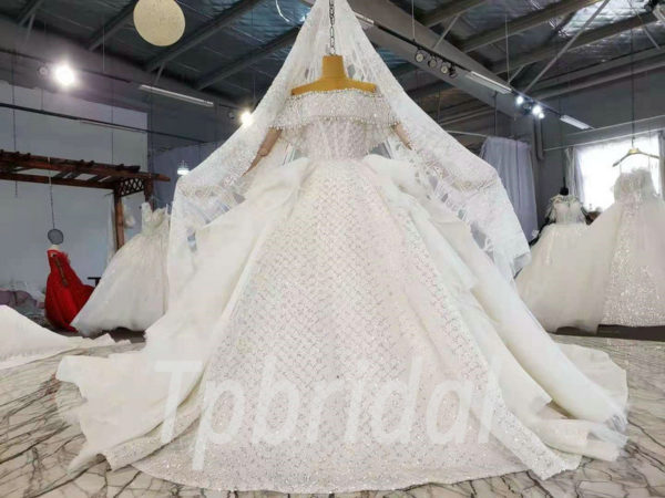 Ball gown wedding dress with veil gorgeous off the shoulder cap sleeve hand made beaded lace pearl bling long train bridal gown online