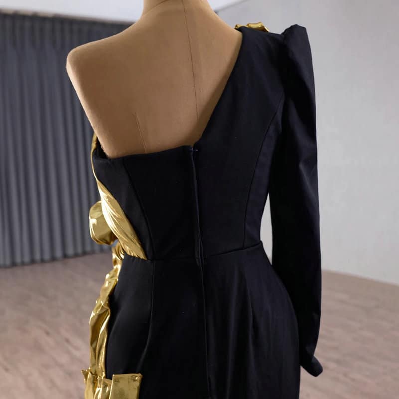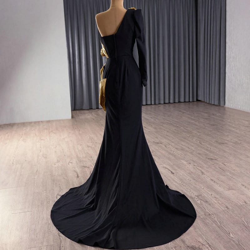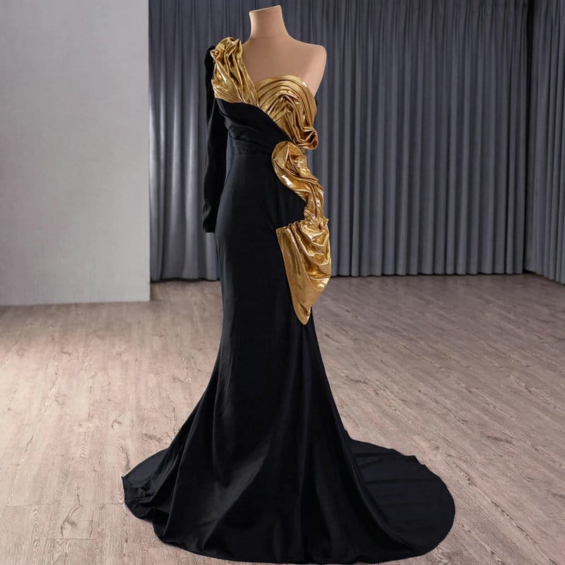 Black and gold evening dress one shoulder long sleeve ruching satin mermaid wedding guest dress for sale online.