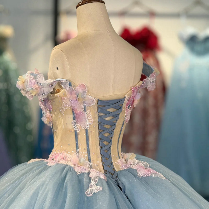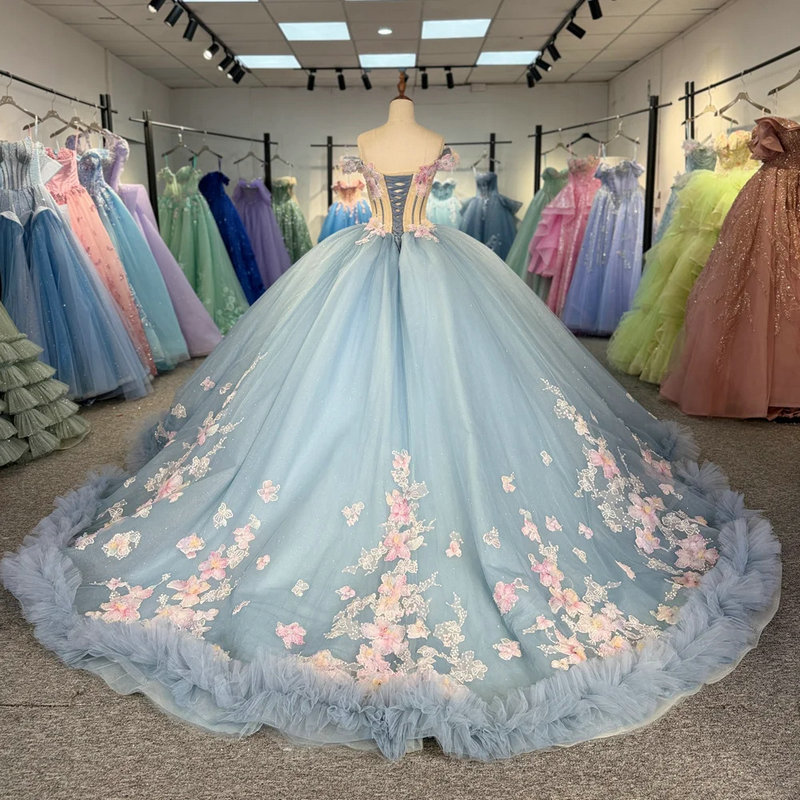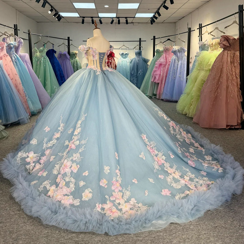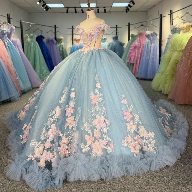 Blue and pink quinceanera dresses gorgeous off the shoulder ball gown hand made princess sweet 16 dress with 3d flowers wholesale.