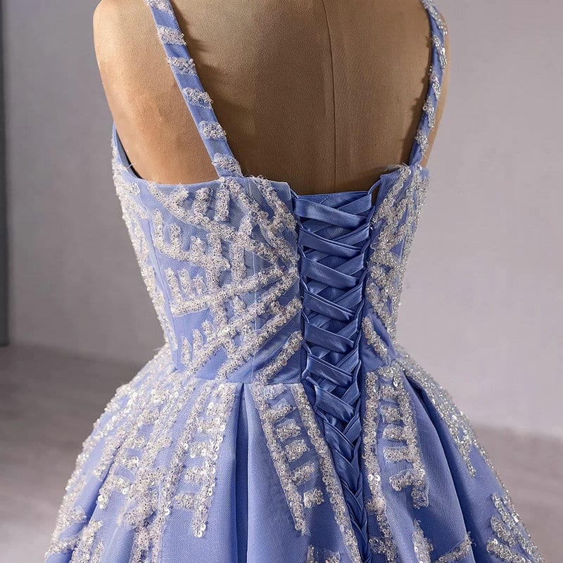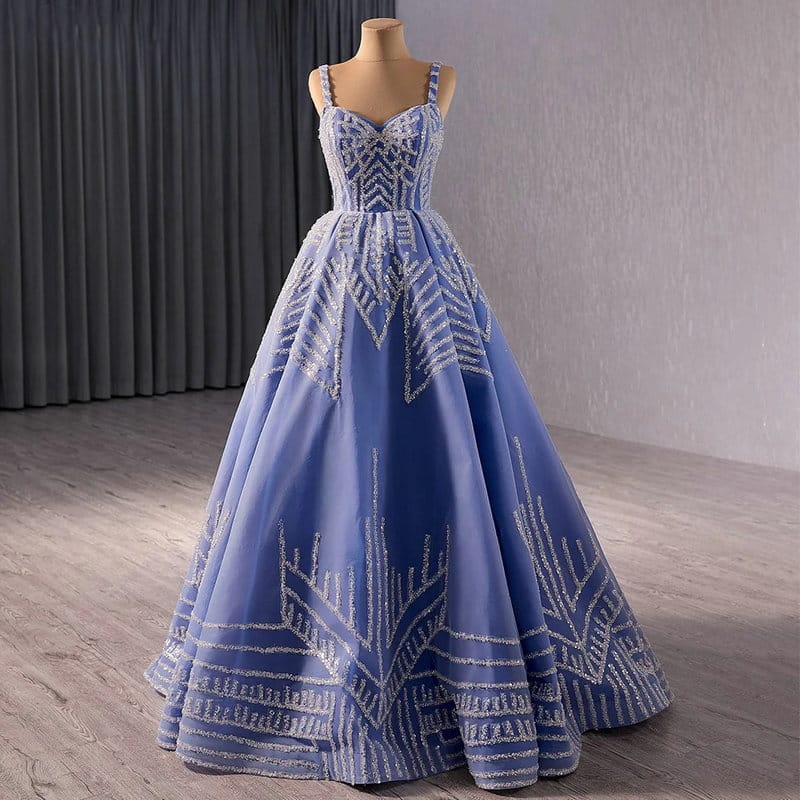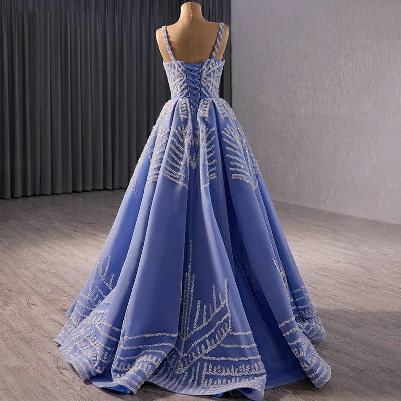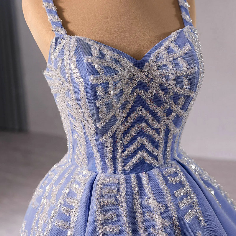 Blue and white prom dress unique spaghetti strap sweetheart ball gown detachable heavy beaded gorgeous blue wedding guest dress for sale.