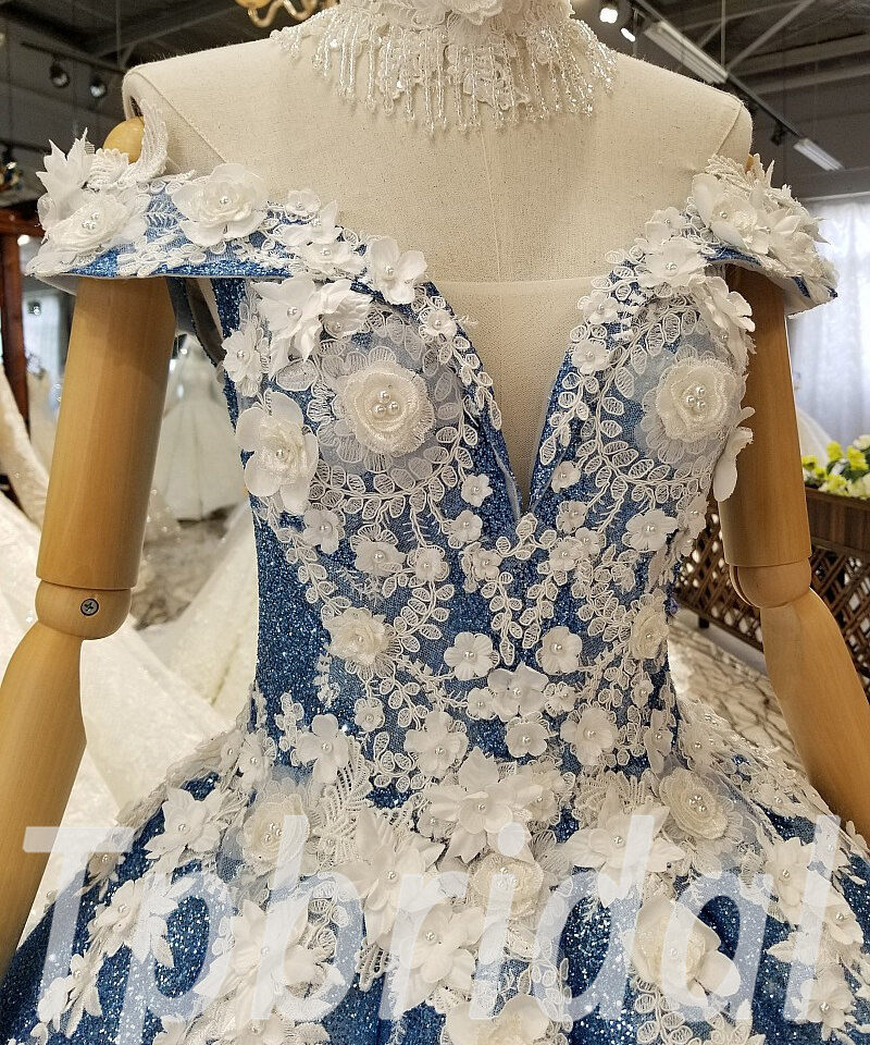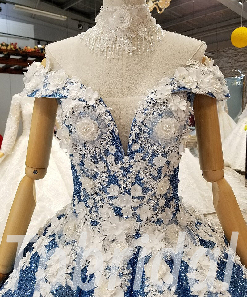 Blue prom dress custom made wedding dress off the shoulder strapless hand made beading white flower lace floor length lace up evening gown wholesale online