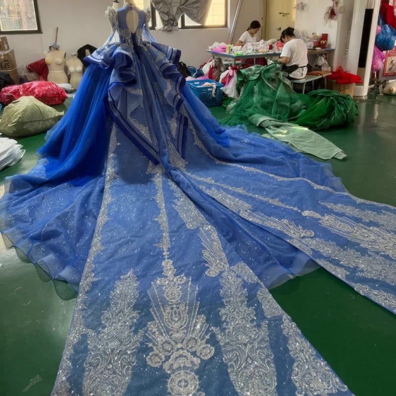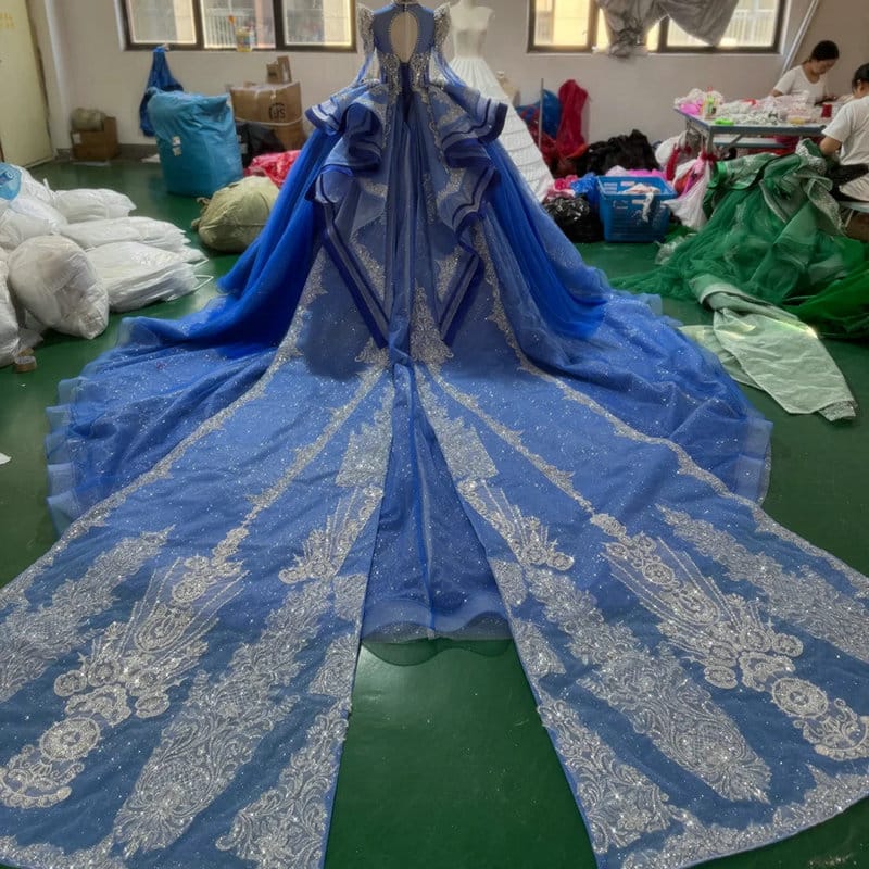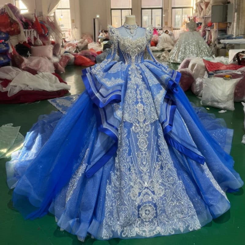 Blue wedding gown gorgeous high neck ball gown long sleeve beaded lace hand made blue and silver color weddiing dress for sale.