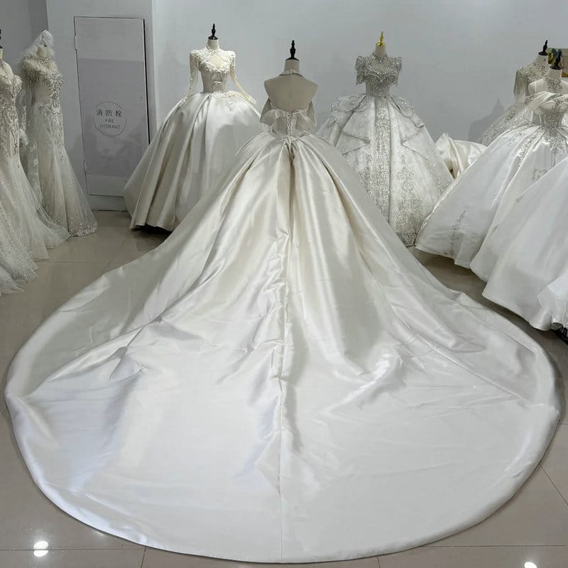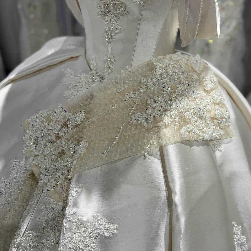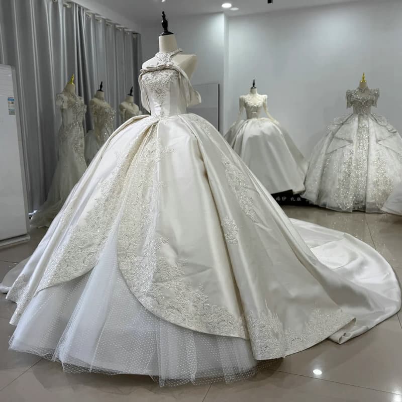 Bridal princess dress gorgeous off the shoulder ball gown hand made beaded lace satin wedding dress with long train for sale.