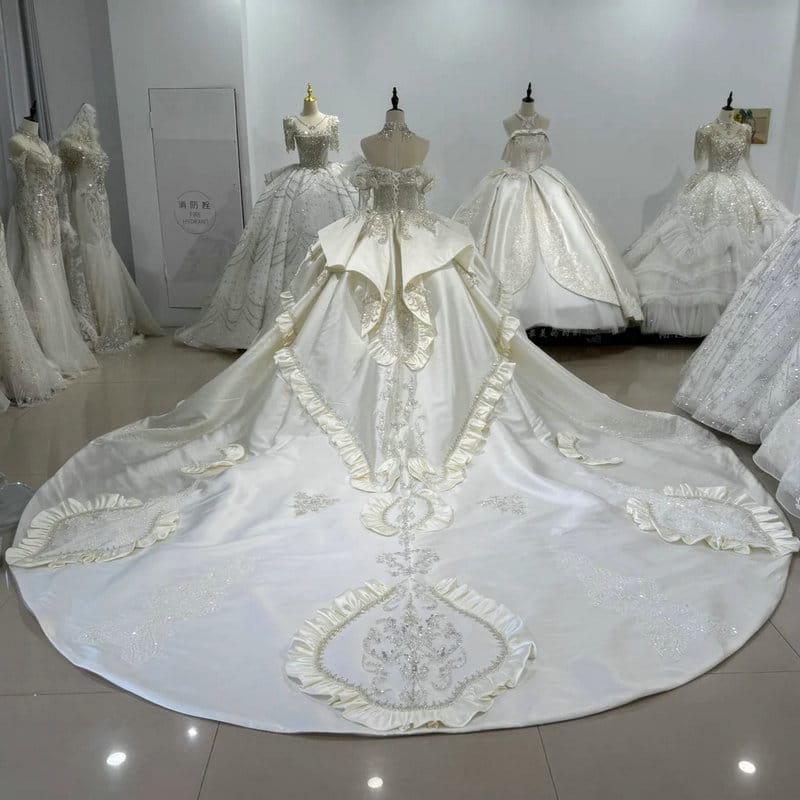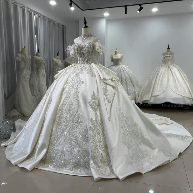 Cinderella wedding dress luxury off the shoulder short sleeve crystal heavy beaded lace wedding dress with long train wholesale.