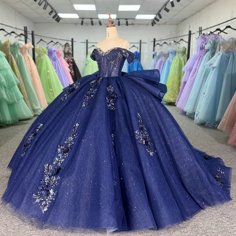 Dark blue quinceanera dresses gorgeous off the shoulder ball gown short sleve hand made beaded pearls lace up ball gown sweet 16 dress for sale.