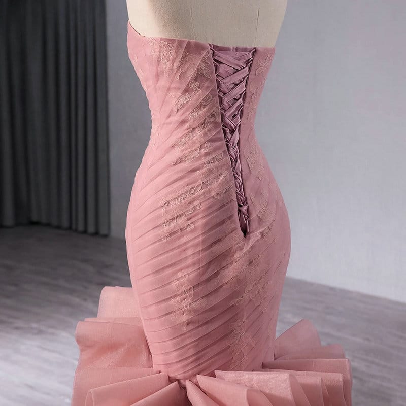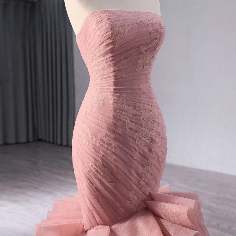 Dusty pink evening dress unique strapless mermaid ruche formal prom dress plus size wedding guest dress for sale online.