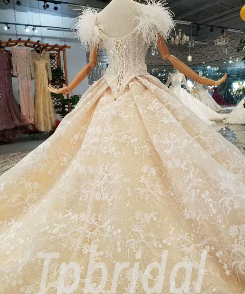 Feather wedding dress off the shoulder haute couture luxury hand made beading crystal lace champagne plus size lace up shopping online for sale