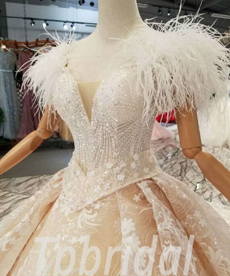 Feather Wedding Dress Haute Couture Champagne Long Train