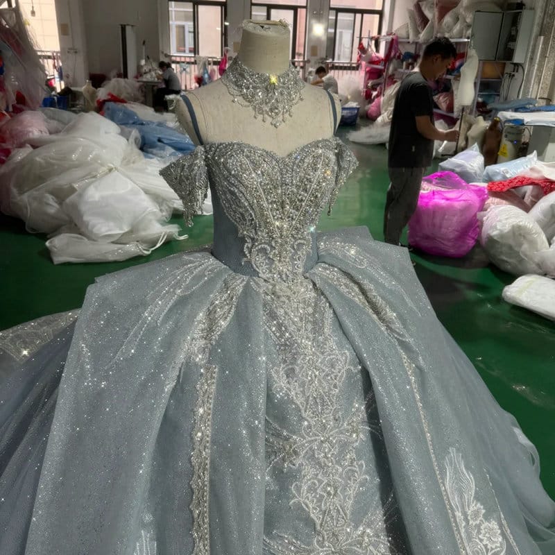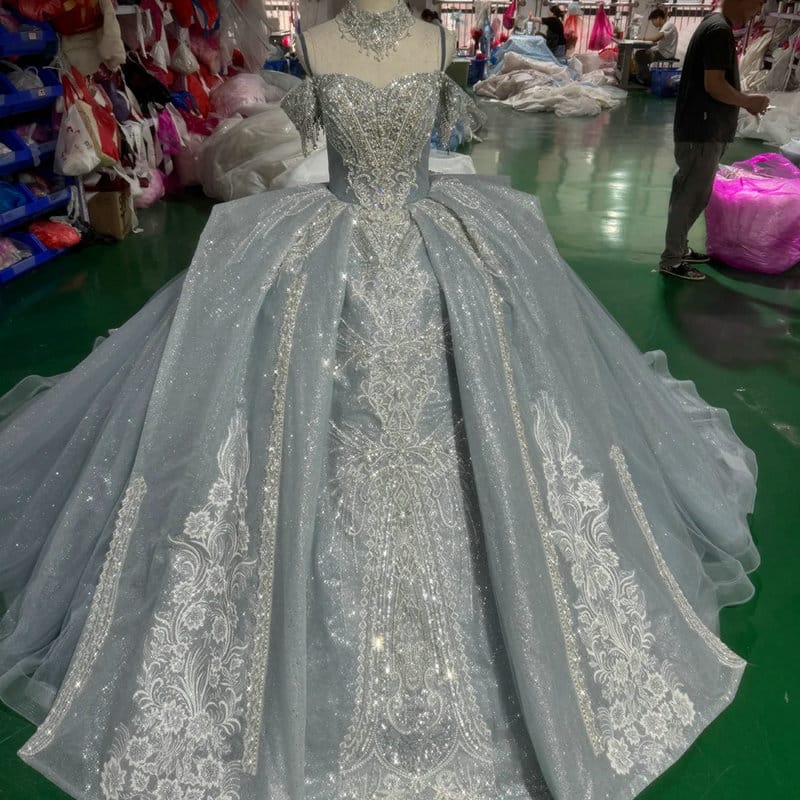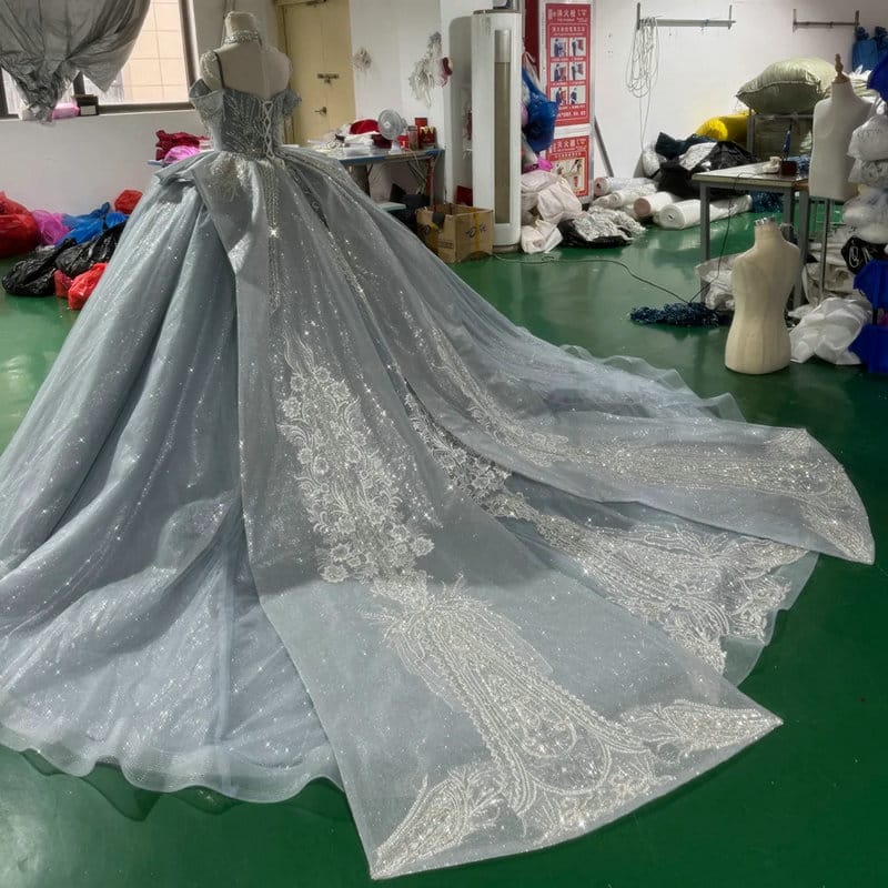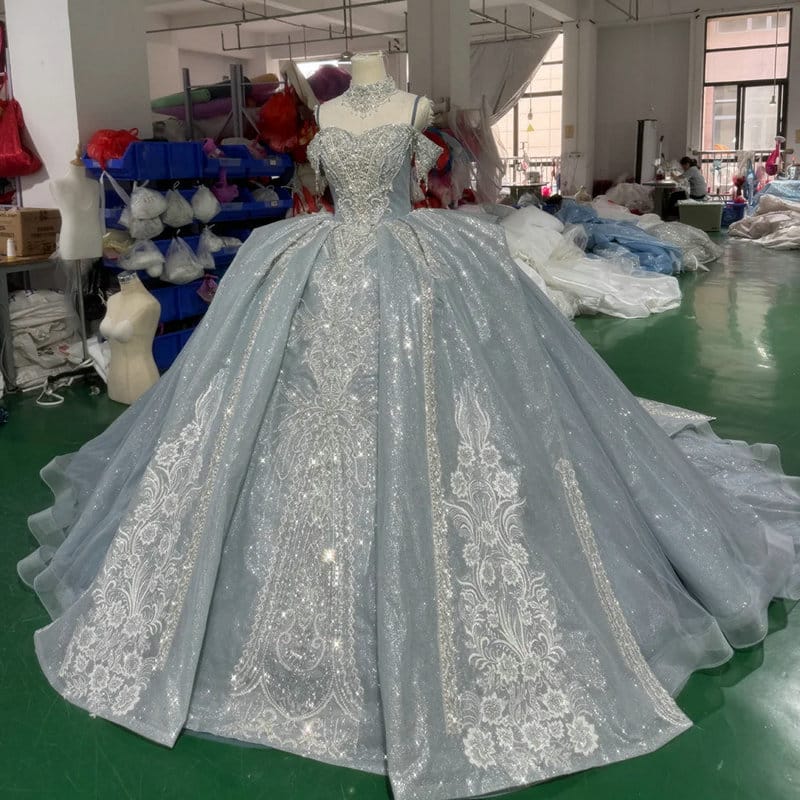 Grey wedding dress gorgeous off the shoulder sweetheart ball gown hand made beaded lace sparkly princess quinceanera dress for sale.