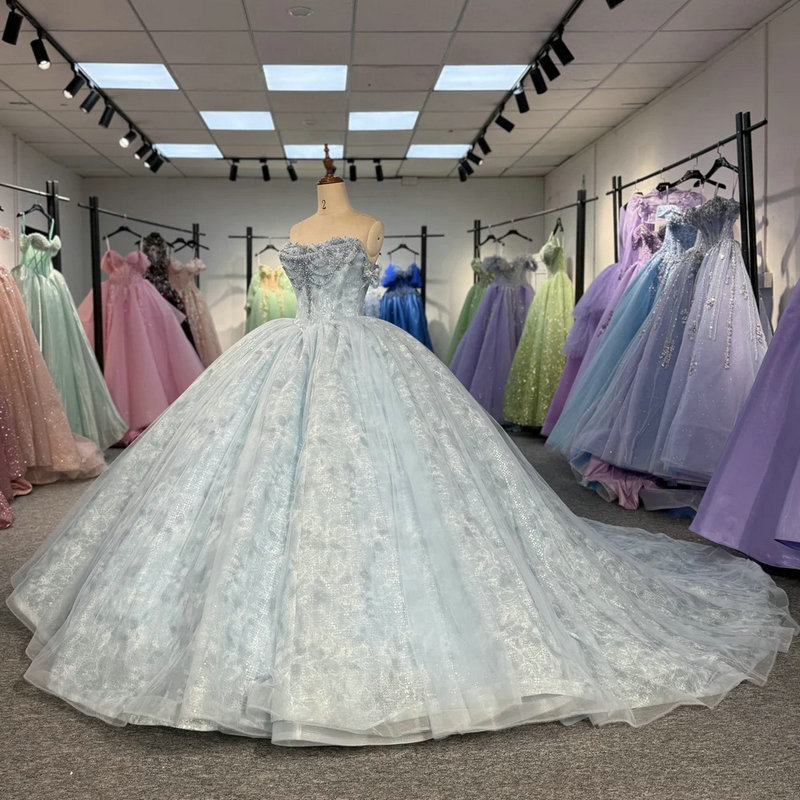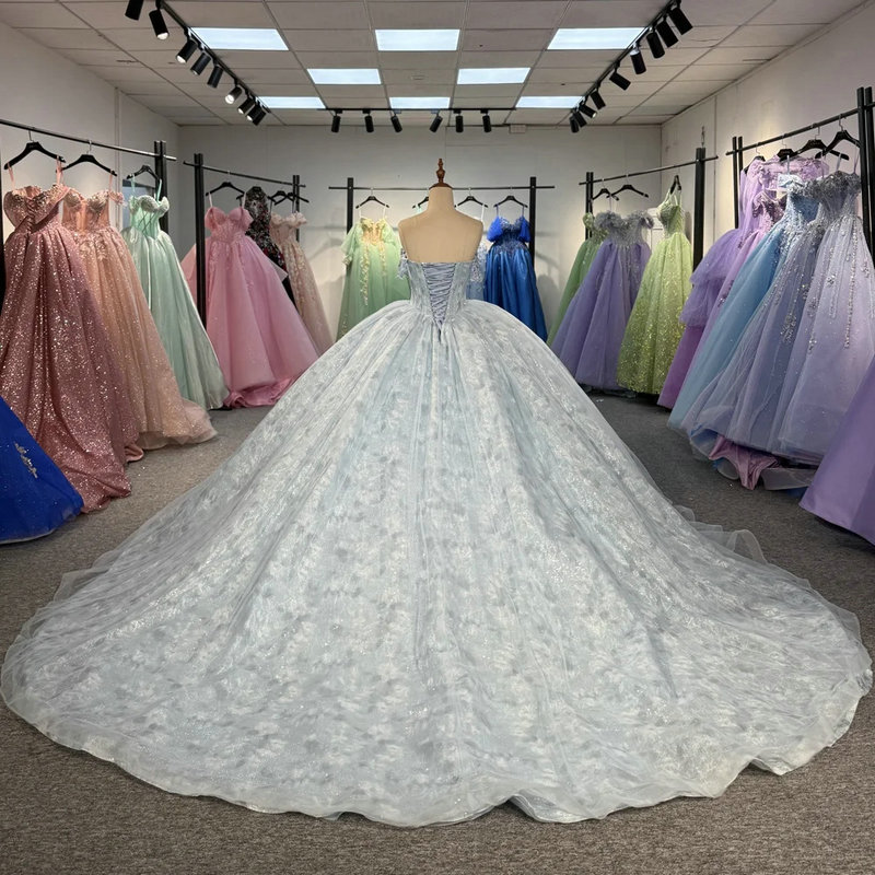 Ice Blue Off-Shoulder Ball Gown with Crystal Beaded Lace & Cathedral Train