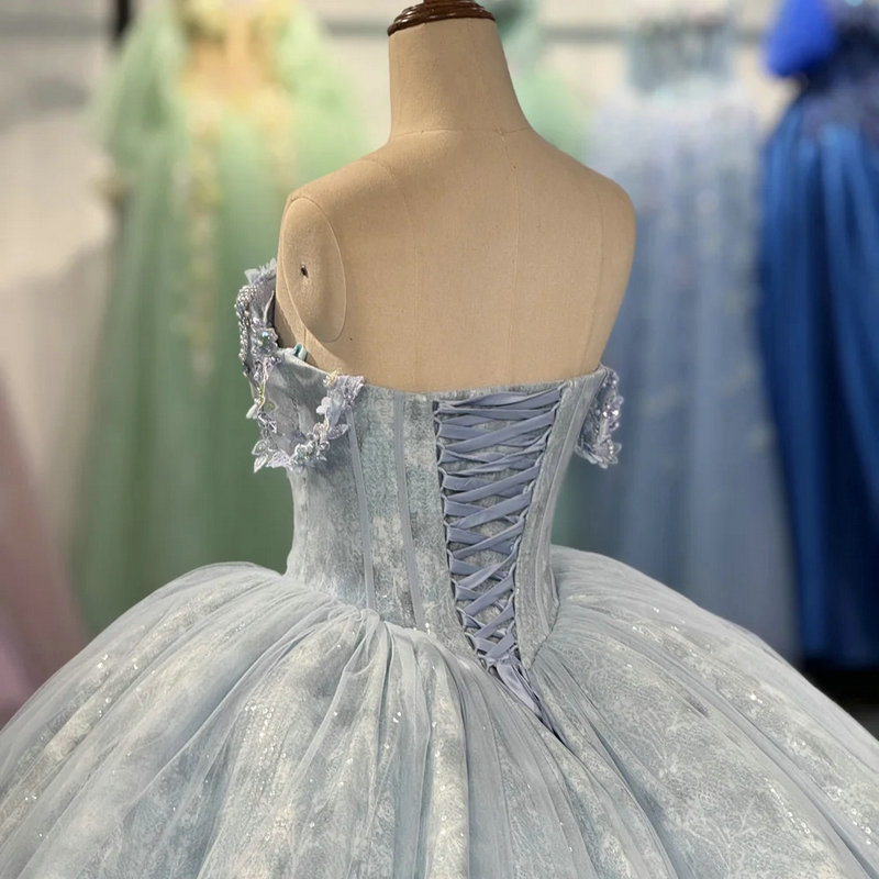 Grey wedding dress gorgeous off the shoulder ball gown princess hand made beaded lace silver blue quinceanera dress for sale.