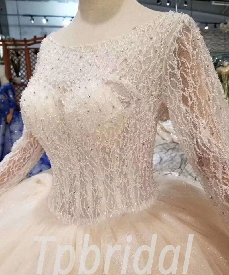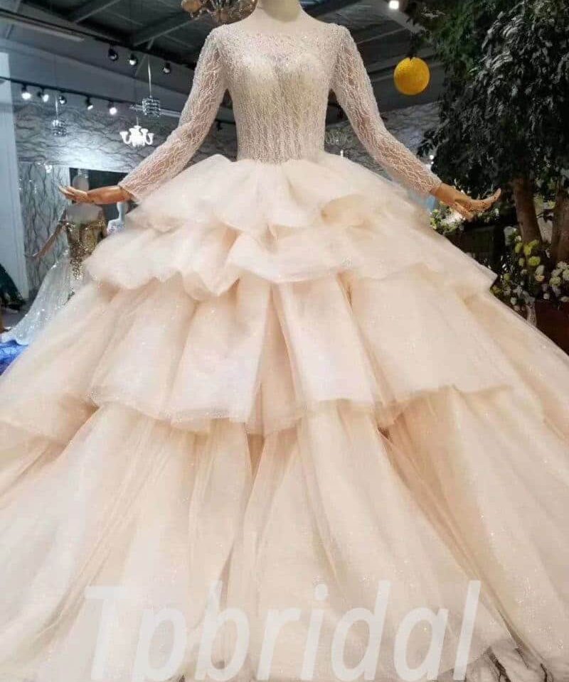 Layered wedding dress round collar long sleeve ball gown hand made beading haute couture custom made bridal dress with train online shopping