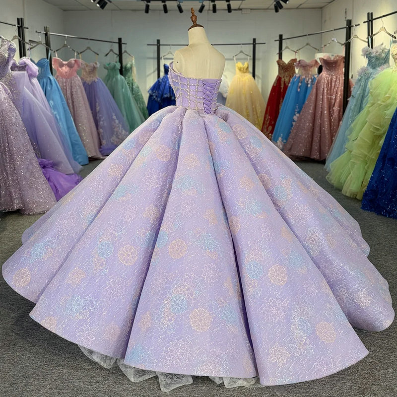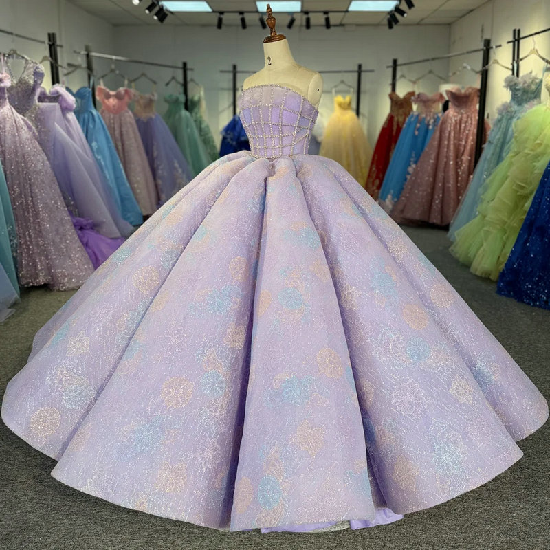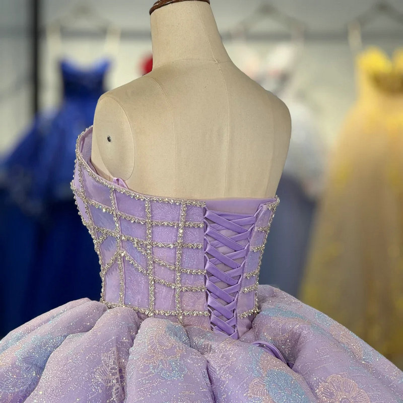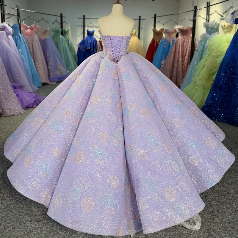 Light purple quinceanera dresses luxury strapless ball gown sleeveless lace up heavy beaded sparky flowers lace sweet 16 dress for sale.