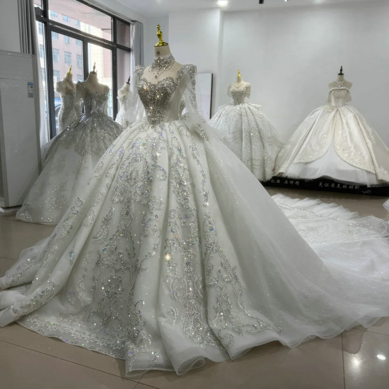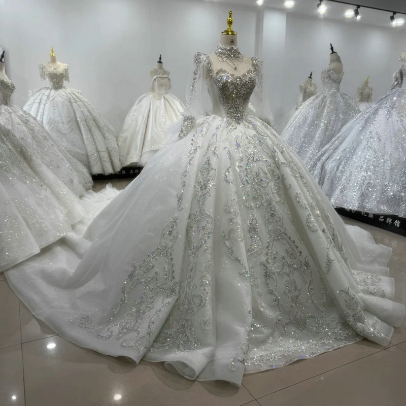 Long sleeve wedding dresses gorgeous lace hand made beaded plus size bridal dress with necklace wholesale online for sale.