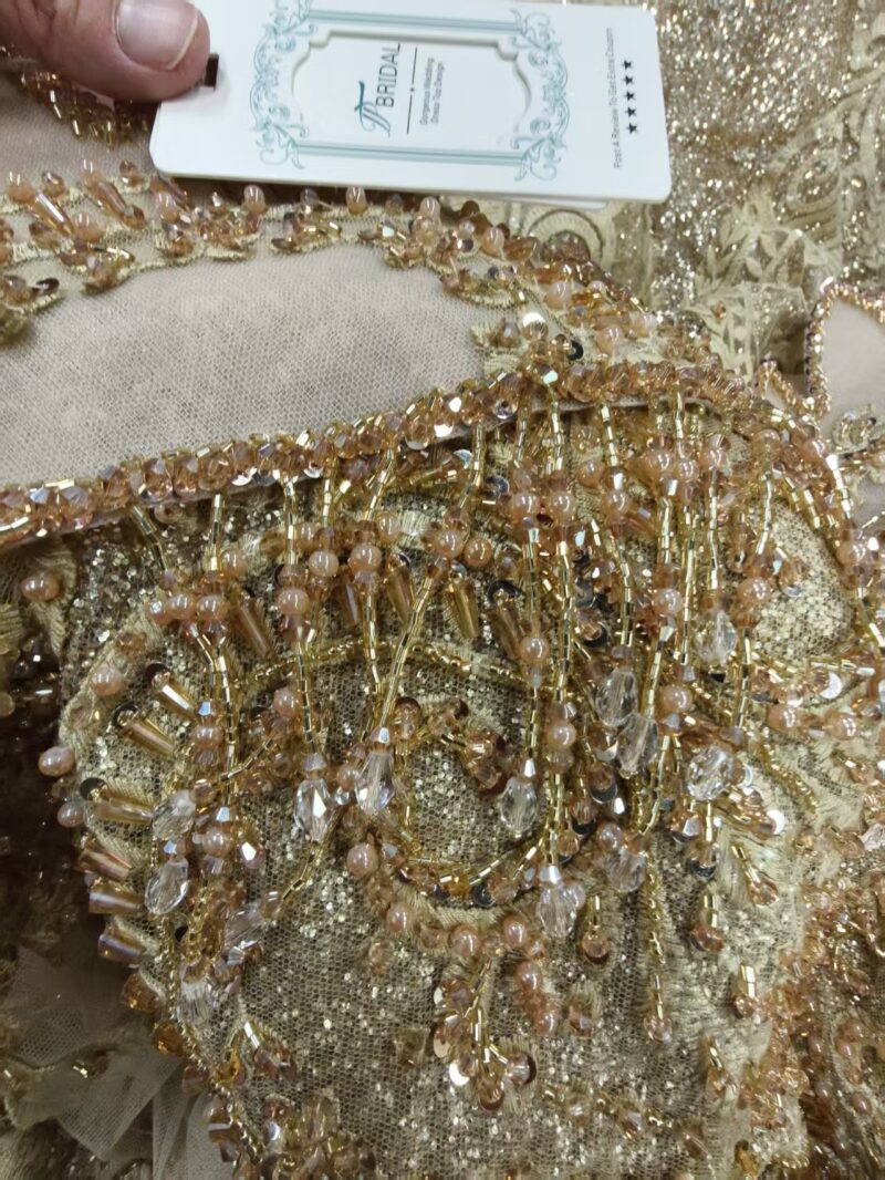 This is a custom-made plus-size dress, for which the client has selected custom measurements. Make a breathtaking entrance in this luxurious off-the-shoulder ball gown. Radiating opulence in a dazzling gold hue, the bodice is meticulously adorned with sparkling beaded details that catch the light. The full, dramatic skirt creates a timeless silhouette, making this an exceptionally versatile and stunning choice for your senior prom, formal gala, or even as a non-traditional wedding gown.