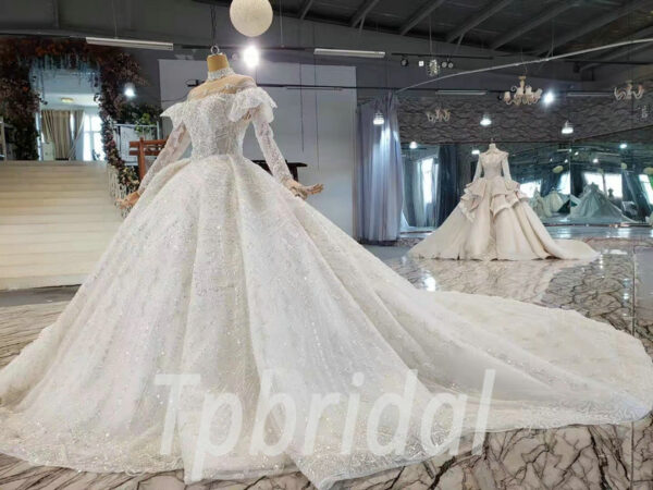 Off the shoulder long sleeve wedding dress gorgeous high neck ball gown hand made crystal beaded long train white bridal gown 2021 with train