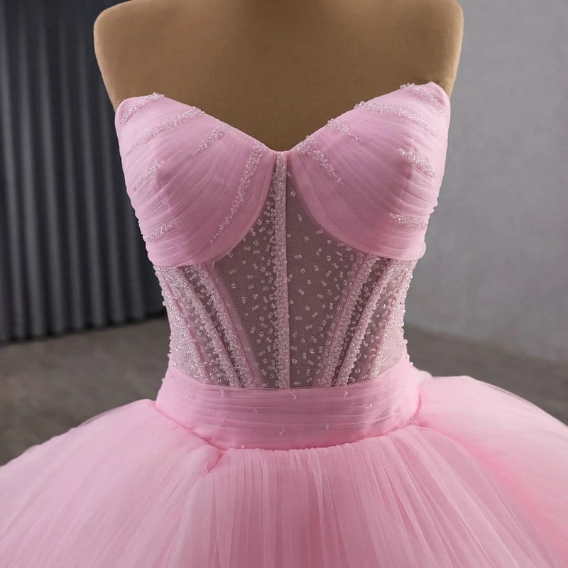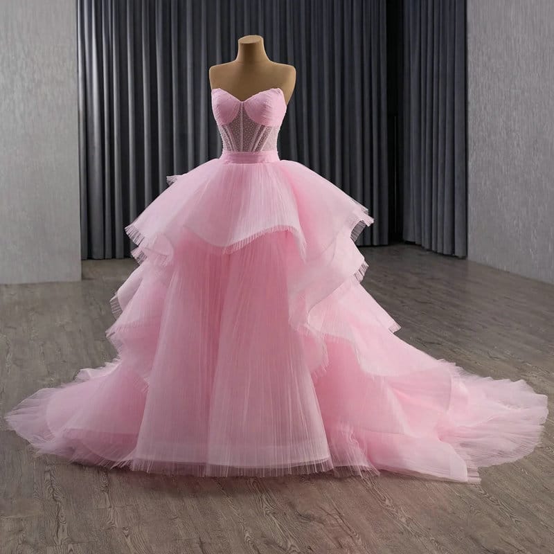 Pink prom dress gorgeous sweetheart ball gown sleeveless lace up back ruching formal wedding guest dress with train for sale.