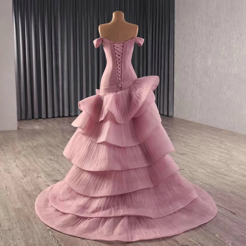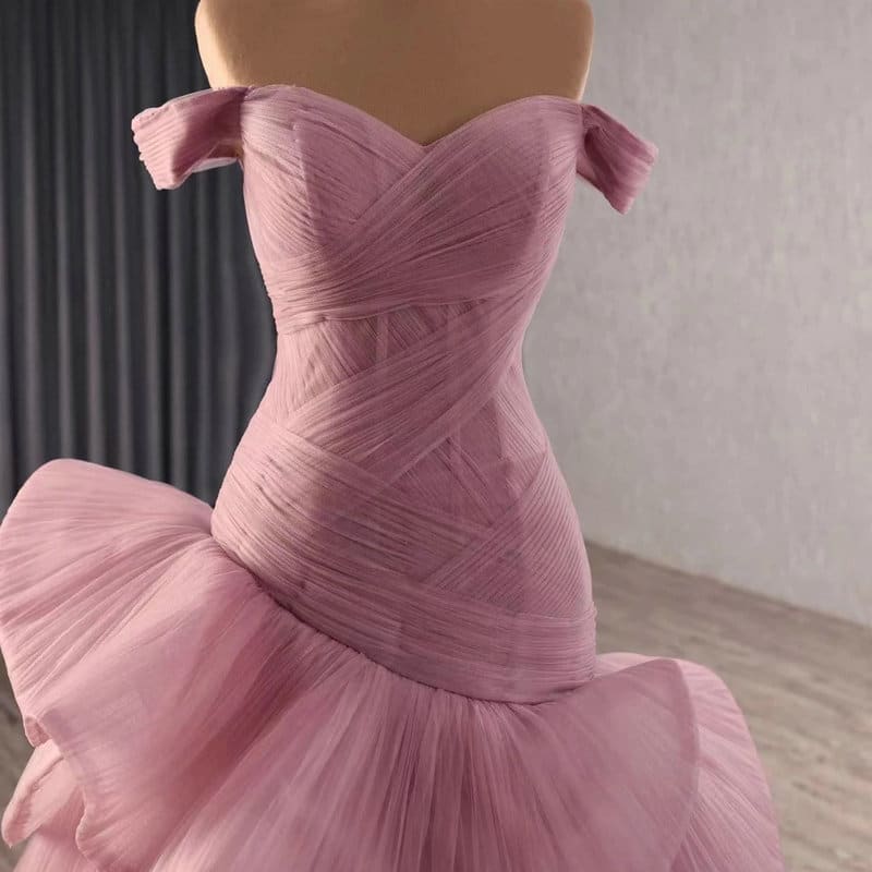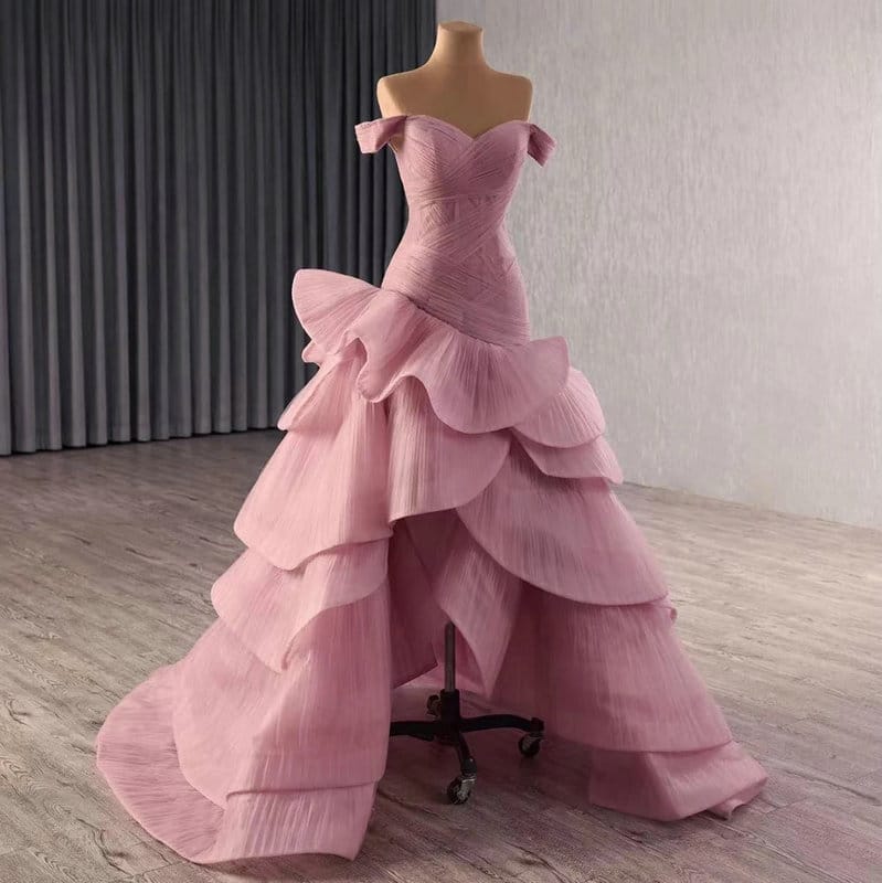 Pink wedding guest dress off the shoulder sweetheart a line high low ruching formal prom dress dusty pink evening gown for sale.
