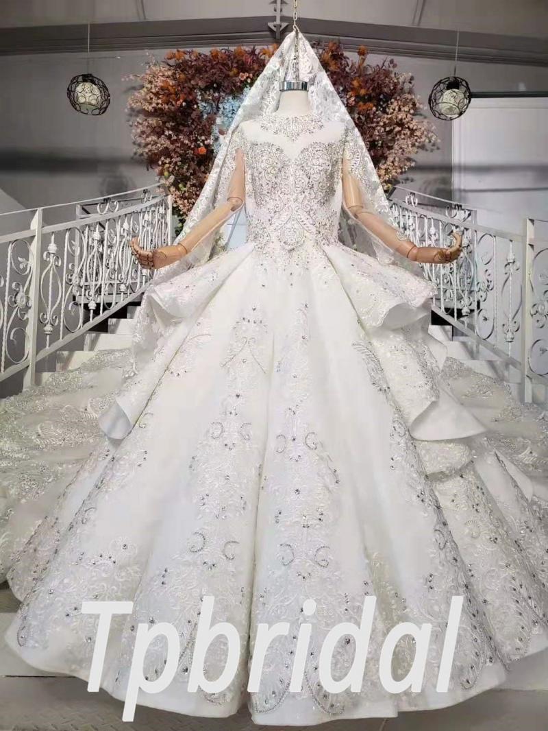 Princess wedding gown gorgeous haute couture high neck ball gown long sleeve hand made crystal beading lace bridal dress long train with veil