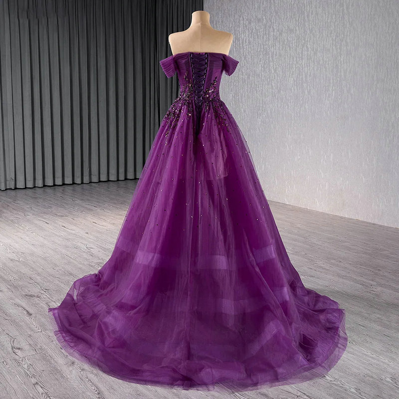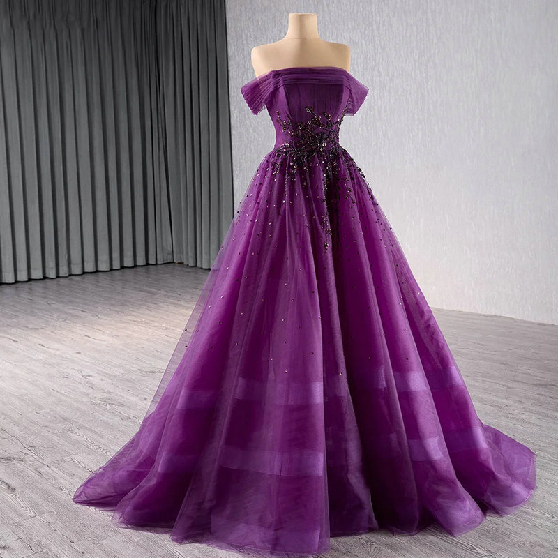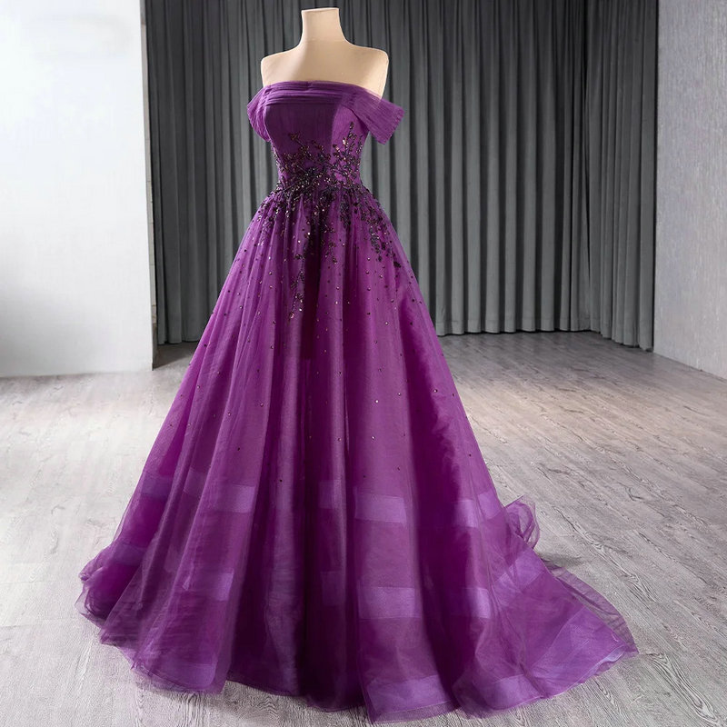 Purple wedding guest dress gorgeous off the shoulder a line hand made beaded crystal formal evening dress prom dress wholesale online for sale.