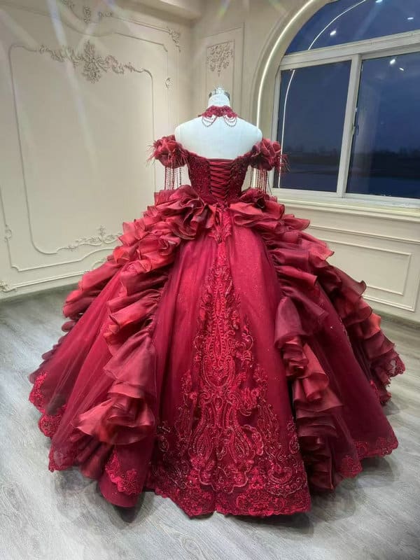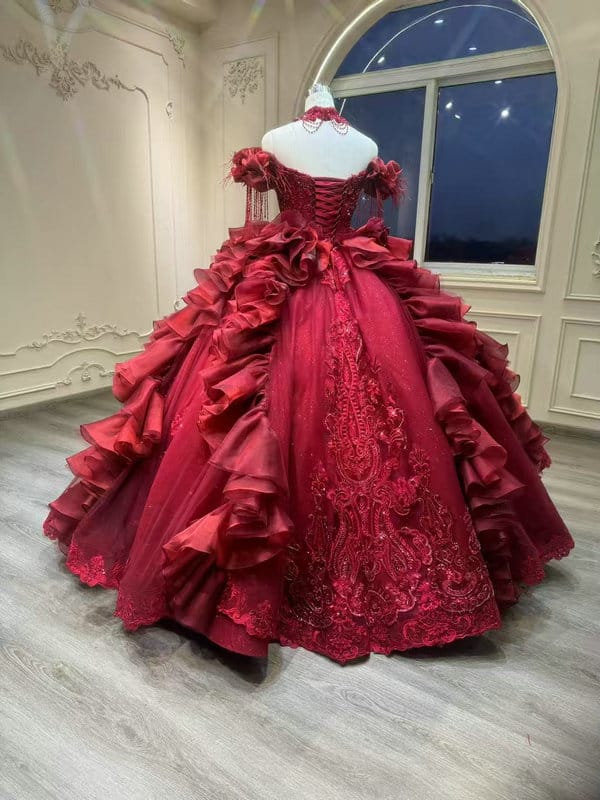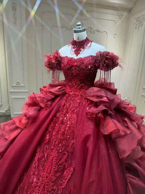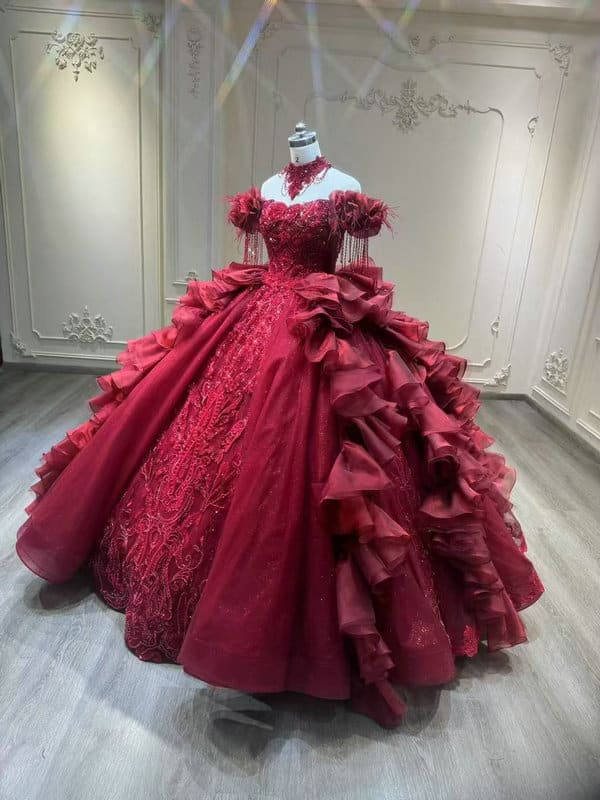 Red lace prom gown off the shoulder ball gown heavy beaded lace hand made princess color wedding dress red quince dress for sale.