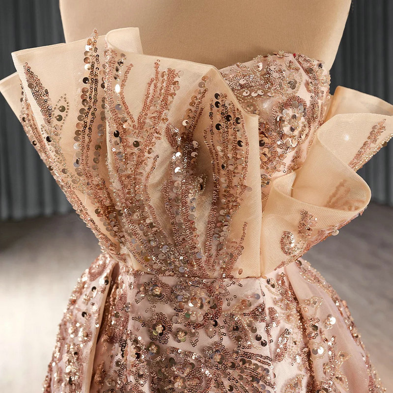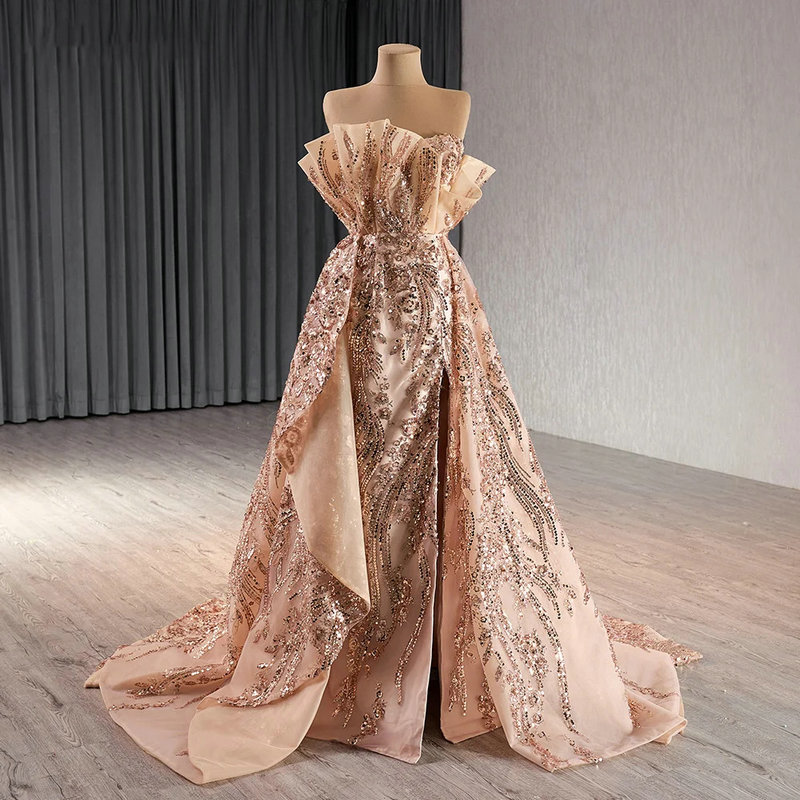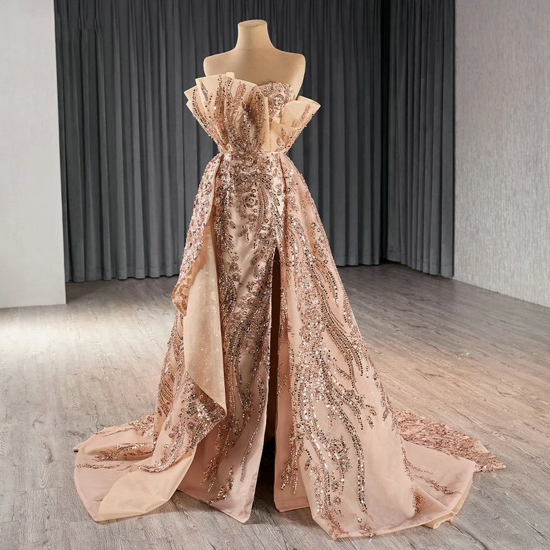 Rose gold mother of the bride dresses gorgeous strapless sheath/column hand made beaded sleeveless lace up formal evening dress with train.
