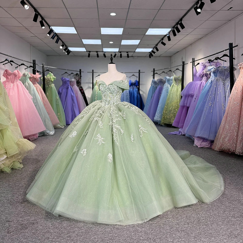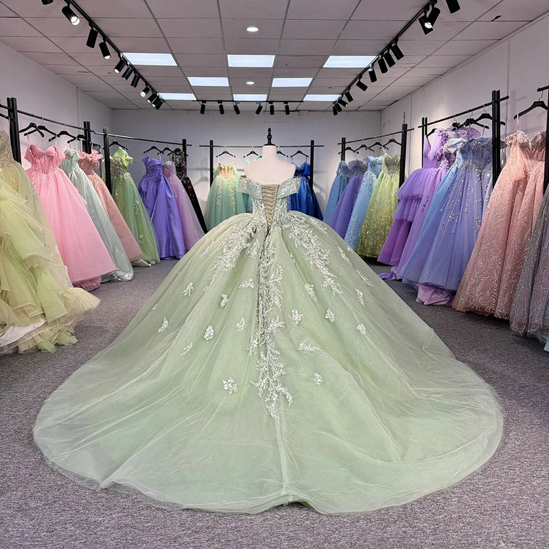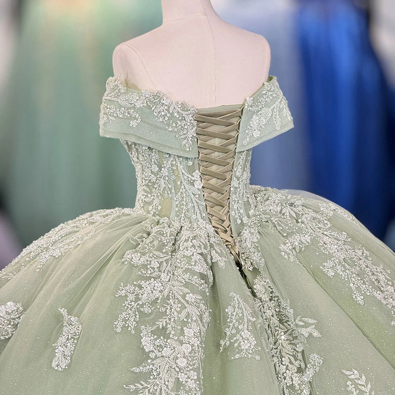 Sage green quinceanera dress gorgeous off the shoulder ball gown sparkly lace flower princess sparkly sweet 15 dress for sale.