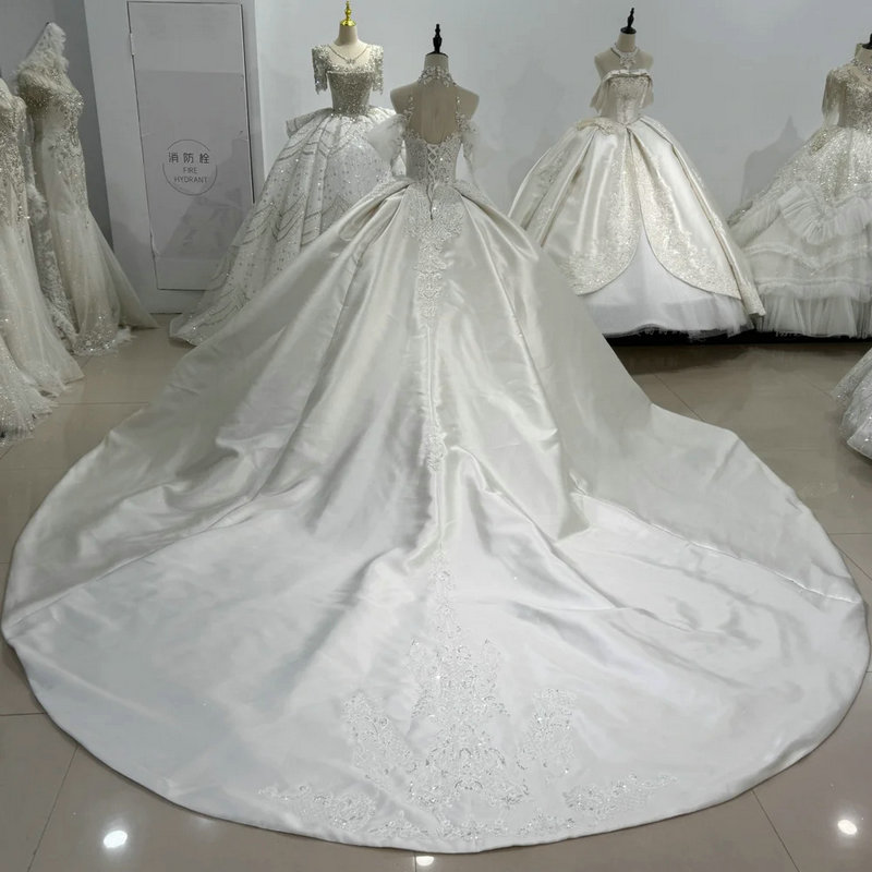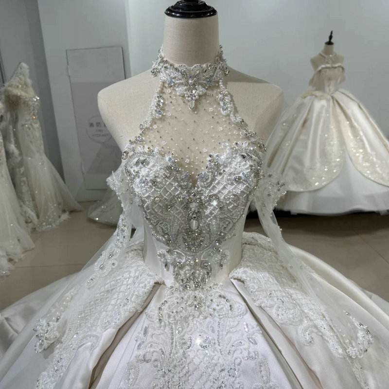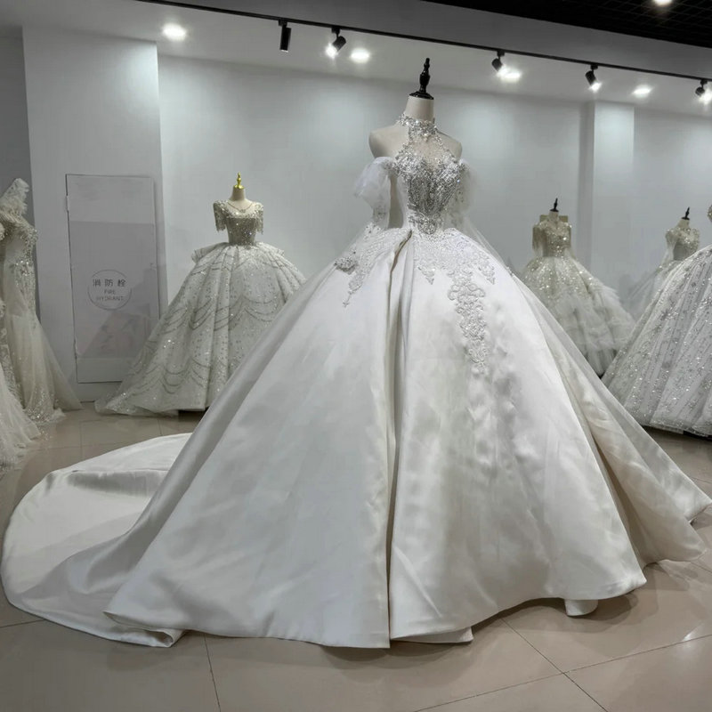 Satin ball gown wedding dress luxury halter detachable sleeves 3 in 1 hand made beaded lace haute couture church wedding gown for sale.