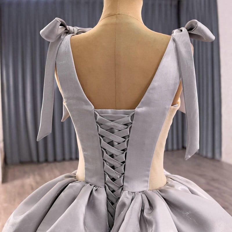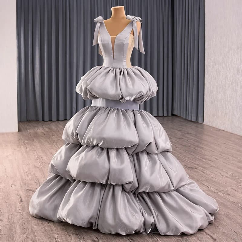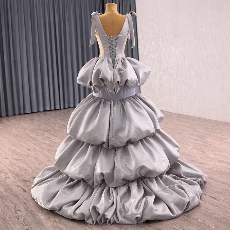 Silver evening dress v neck sleeveless zipper back silver satin unique grey layered puffy formal prom dress wholesale online for sale.