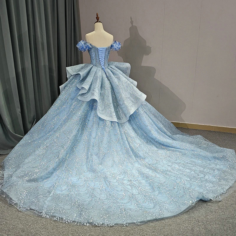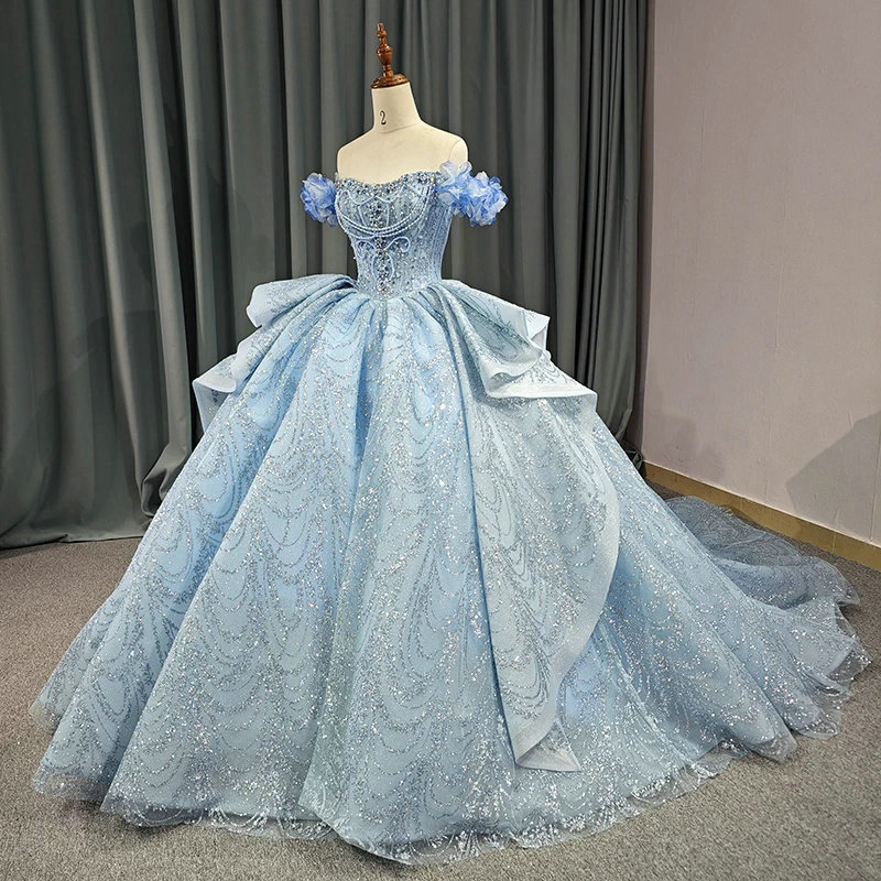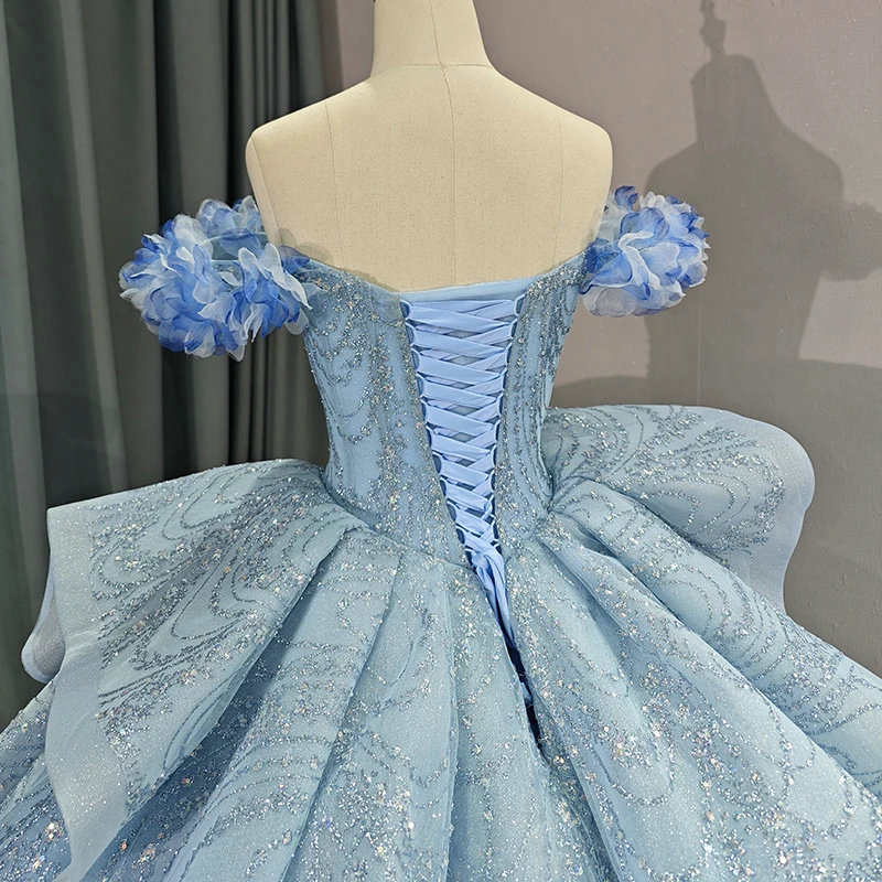 Sky blue quinceanera dresses gorgeous off the shoulder ball gown lace up hand made beaded sparkly sweet 16 dress for sale.
