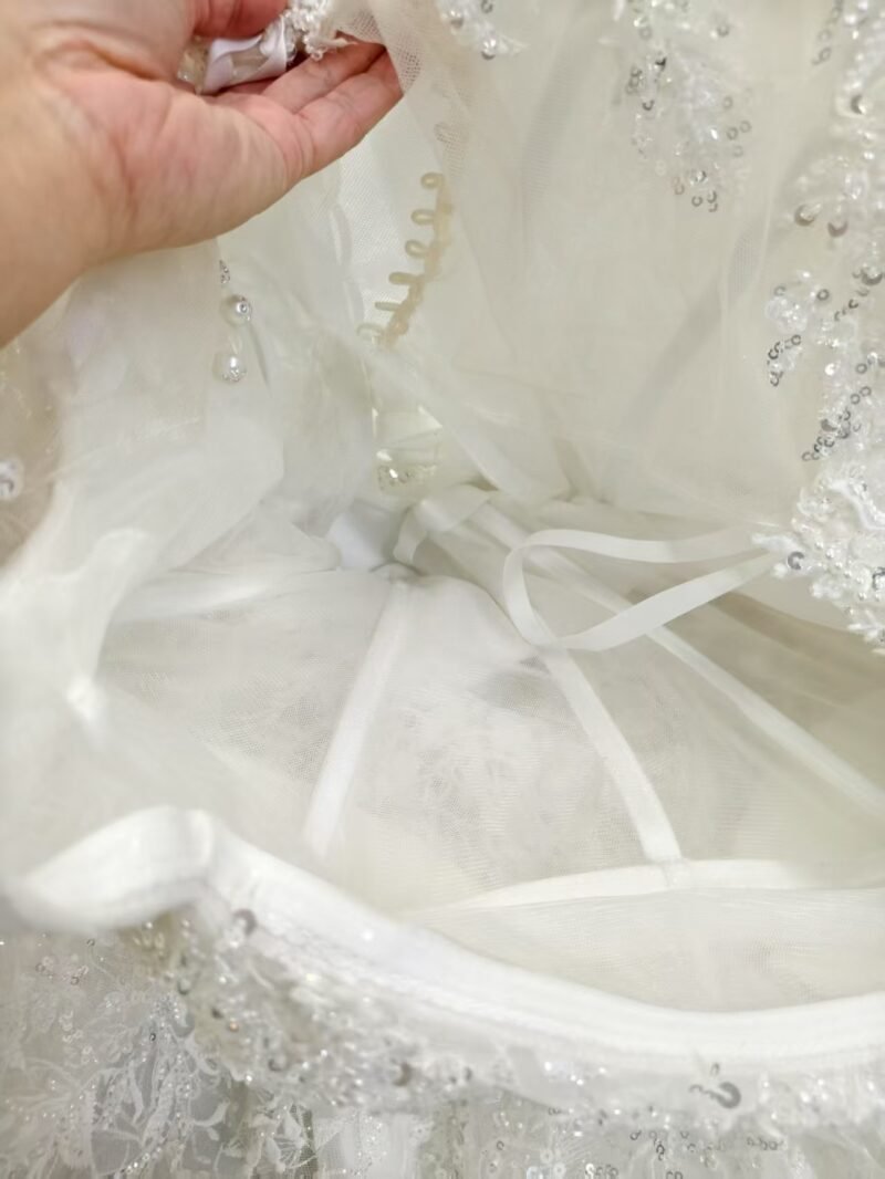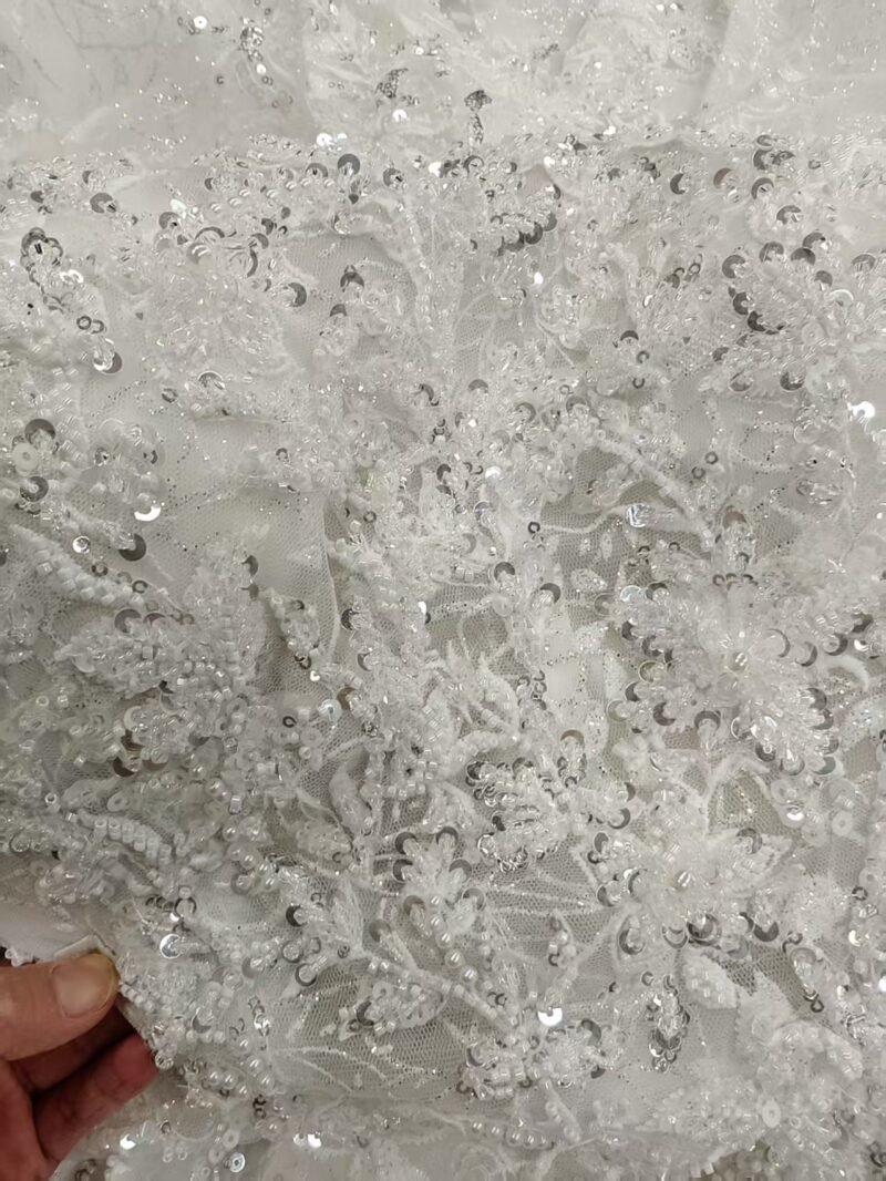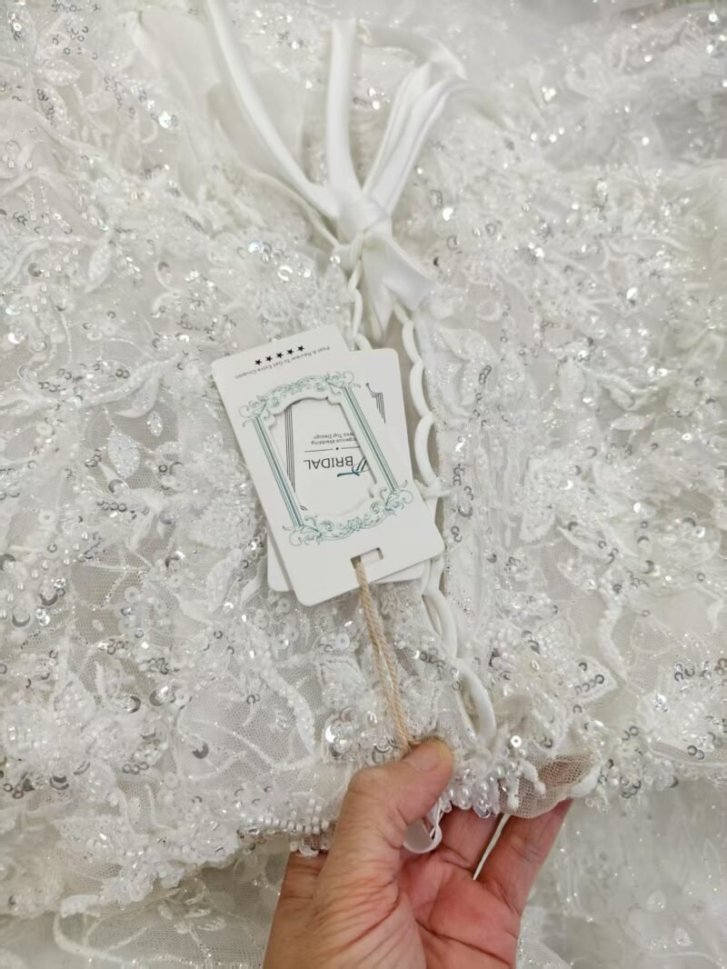 This luxurious custom-designed ball gown redefines bridal elegance with its striking square neckline and long sleeves adorned with intricate heavy beading. Crafted for a grand entrance, the gown features a breathtaking 3-meter-long train and is paired with an ethereal 4-meter veil, creating a showstopping silhouette perfect for a fairytale wedding. Handcrafted with precision, the gown combines timeless sophistication with opulent details, ensuring you captivate every gaze as you walk down the aisle. Ideal for brides seeking a blend of tradition and drama.