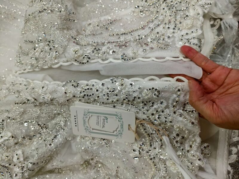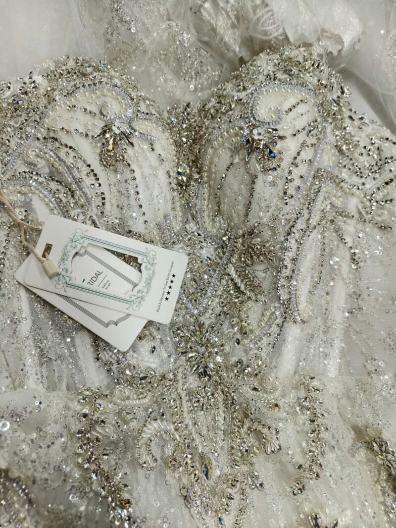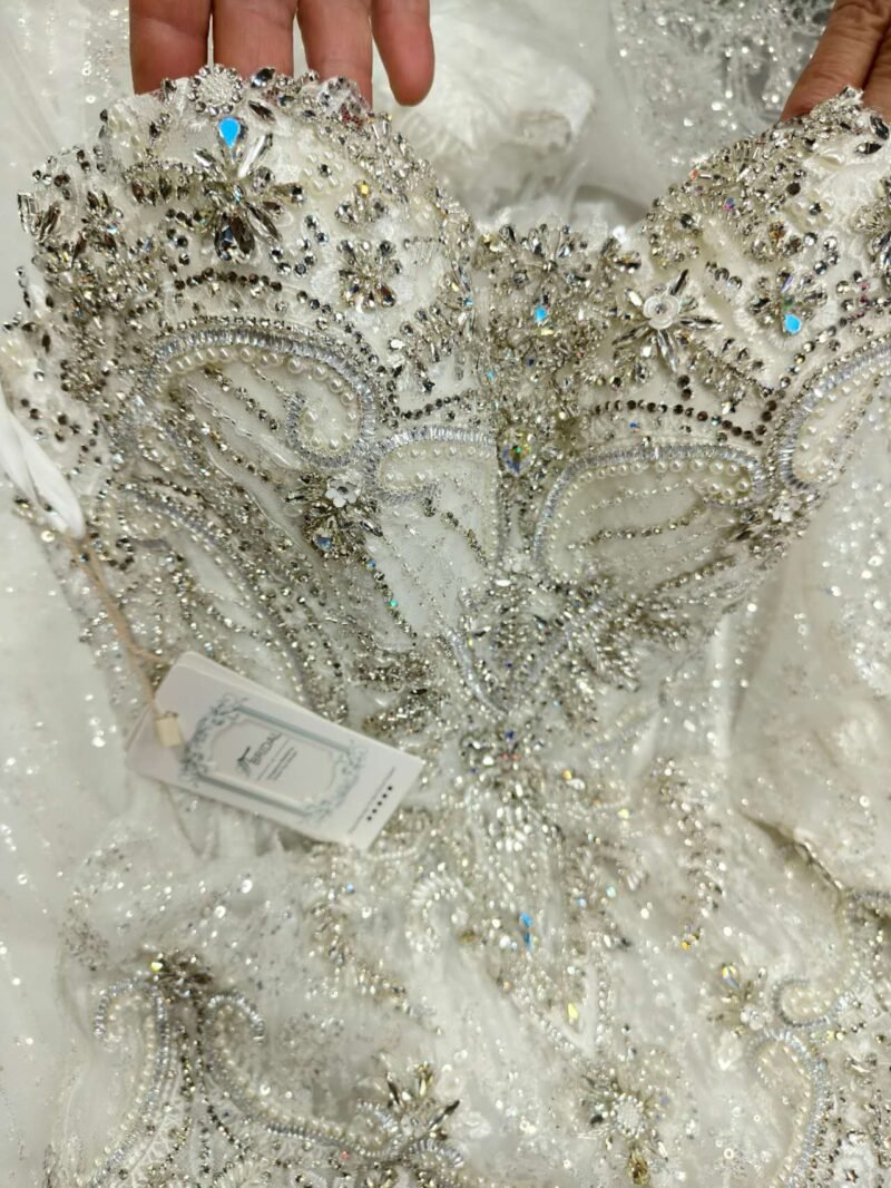 Make a radiant entrance in this exquisite sweetheart-neckline mermaid wedding gown, featuring intricate beadwork and shimmering crystal embellishments. The detachable train offers versatile styling options, transforming from ceremony grandeur to reception ease while maintaining its glamorous silhouette.”