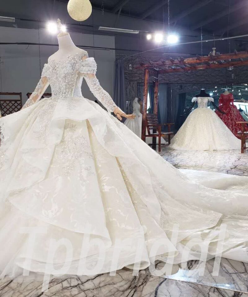 Winter wedding dresses off the shoulder ball gown hand made bead crystal lace long train formal bridal gown custom made 2020 new arrival wholesale